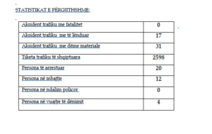 Nga raporti bëhet e ditur edhe se, kanë ndodhur 17 aksidente me të lënduar, dhe, 31 me dëme materiale.