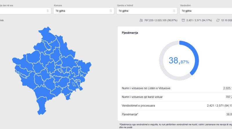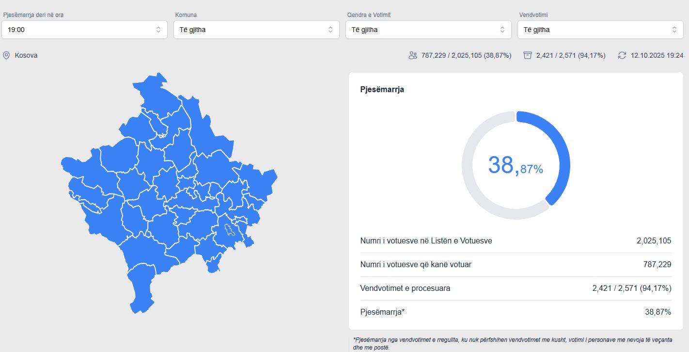 Deri në ora 19:00 sipas Komisionit Qendror të Zgjedhjeve kanë votuar 38,87 për qind apo 787 mijë e 229 qytetarë.