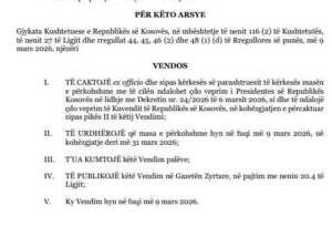 Kushtetuesja deri me datën 31 mars do të dalë me vendimin e saj për të sqaruar nëse Dekreti i Presidentes, Vjosa Osmani, për shpërndarjen e Kuvendit të Republikës së Kosovës ka qenë i drejtë dhe kushtetues.