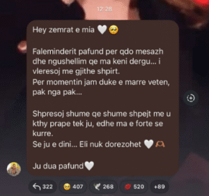 Faleminderit pafund për çdo mesazh dhe ngushëllim që ma keni dërgu… i vlerësoj me gjithë shpirt. Për momentin jam duke e marrë veten, pak nga pak…