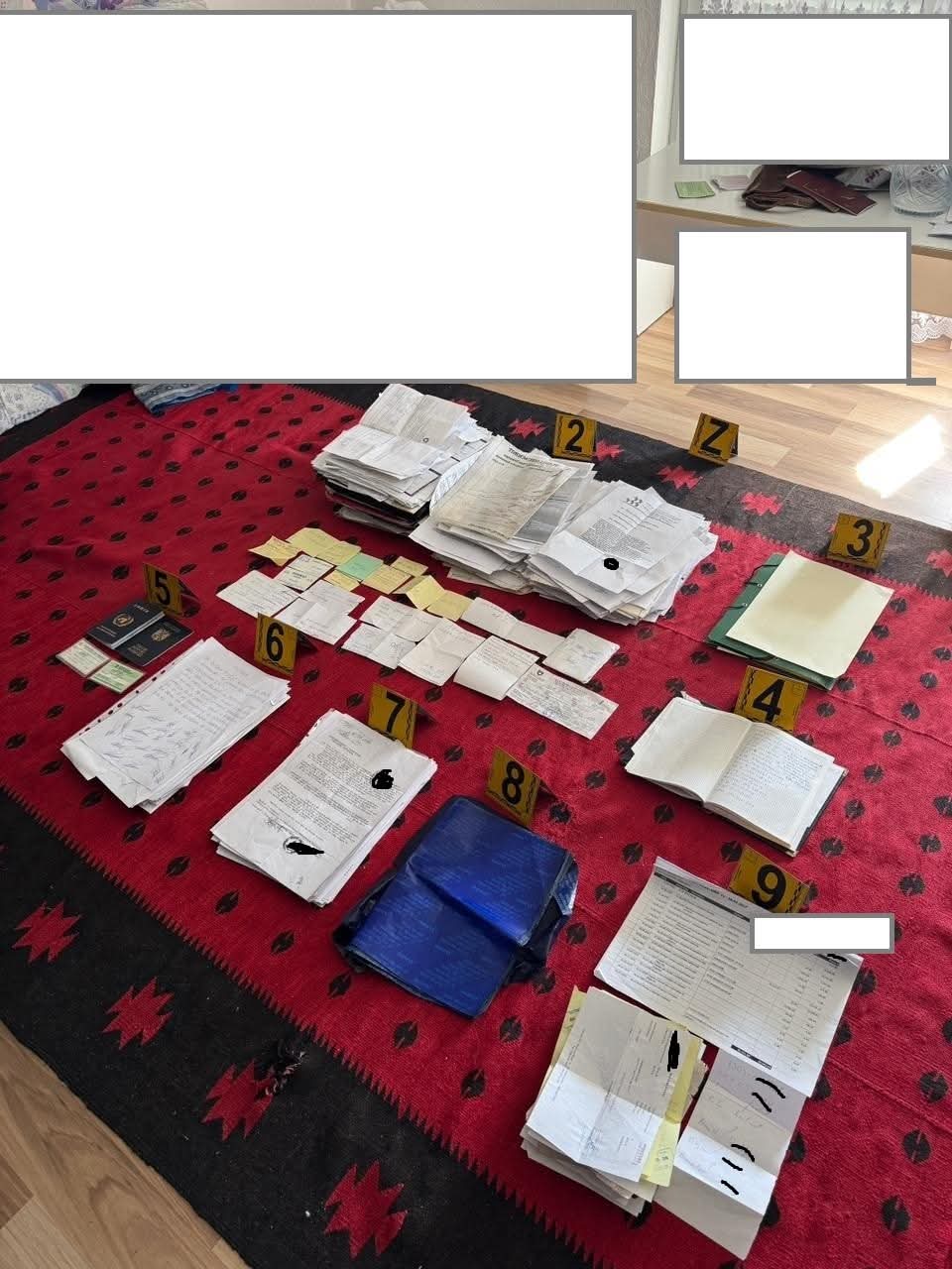 Gjatë aksionit janë sekuestruar dokumente që lidhen me rastin, pajisje të përdorura për falsifikim (pesë makina shkrimi të vjetradhe një pajisje “Paper Trimmer”), një revole e tipit Zaragio me 103 fishekë, një telefon iPhone 17 Pro, një orë dore Rolex dhe një zinxhir doreRolex.
