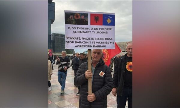 Një protestues në sheshin “Skënderbej” në Tiranë ka tërhequr vëmendjen me mesazhin që përcolli përmes një pankarte, në prag të nisjes së protestës në mbështetje të ish-krerëve të UÇK-së që ndodhen në Hagë.
