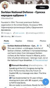 Organizata lobuese serbe “Serbian National Defense”, me seli në Chicago, përmes një postimi publik në rrjetin social X ka sulmuar rëndë Haradinajn.