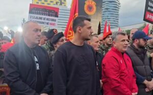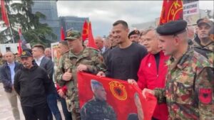 Ai shihet i veshur me simbole të UÇK-së dhe i shoqëruar nga deputeti i PS-së, Taulant Balla.