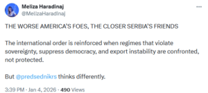Ish-ministrja e Punëve të Jashtme të Kosovës, Meliza Haradinaj, ka reaguar përmes një postimi në platformën “X”, ndaj qëndrimit të Serbisë pas kapjes së presidentit venezuelian, Nicolas Maduro nga SHBA.