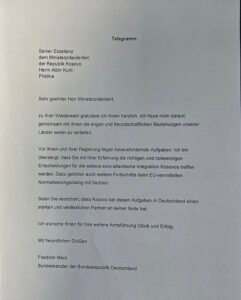 Merz, në letrën e urimit të publikuar nga Zyra e Kryeministrit, shkruan se përpara Kurtit “qëndrojnë detyra sfiduese”.