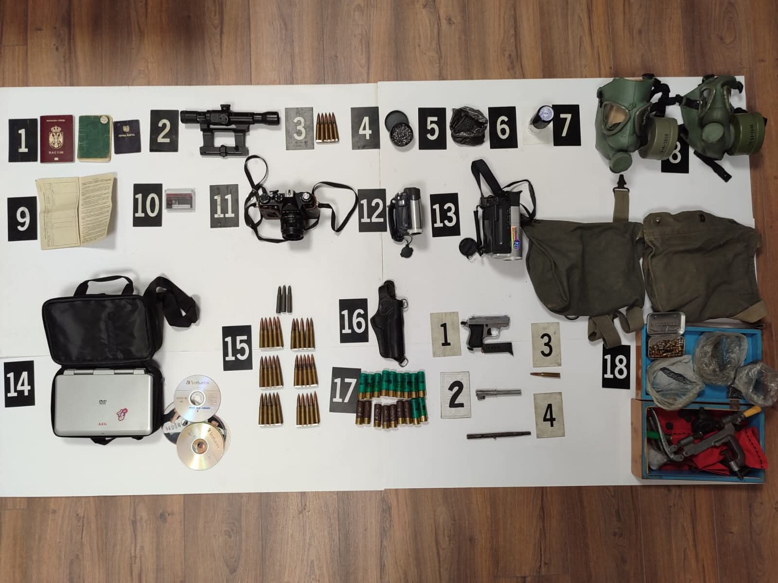 “Gjatë këtij asistimi, në rrugën ‘Lola Ribar’ – Mitrovicë Veri, konkretisht në një banesë e cila ishte e uzurpuar dhe e mbyllur (pa banorë) policia ka gjetur dhe sekuestruar 56 fishekë të kalibrave të ndryshëm, municion për pushkë ajrore, 1 optik për armë të gjatë, 1 kuti për mbushje të municionit, 1 fotrollë për pistoletë, 2 gaz-maska, 2 video-kamera dhe 1 video-kasetë e vogël, dokumente të ndryshme, 1 foto-aparat, 1 lexues (DVD) dhe 1 vulë të rrumbullakët”.