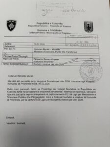 “Me këtë akt percjellës po ju dërgojmë Buxhetin për vitin 2026, i miratuar nga Kuvendi Komunës së Prishtinës me dt. 06.02.2026. Duke marr parasysh faktin se Projektligji për Ndarjet Buxhetore të Republikës së Kosovës është në procedurë të shqyrtimit parlamentar, ndërmjet dy leximeve, kërkojmë nga ana juaj që të veproni mënjeherë në pajtim me nenin 62.3 të Ligjit për Menaxhimin e Financave Publike dhe Përgjegjësitë, duke e dorëzuar buxhetin e miratuar të Komunës së Prishtinës, për ta përfshirë në Ligjin për Ndarjet Buxhetore për vitin 2026”, thuhet në shkresë.