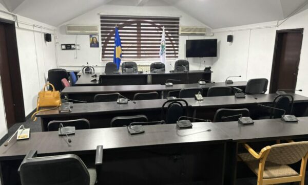 Simbolet dhe flamuri i Kosovës në Kuvendin Komunal të Mitrovicës Veriore ku do të bëhet betimi i kryetarit të ri